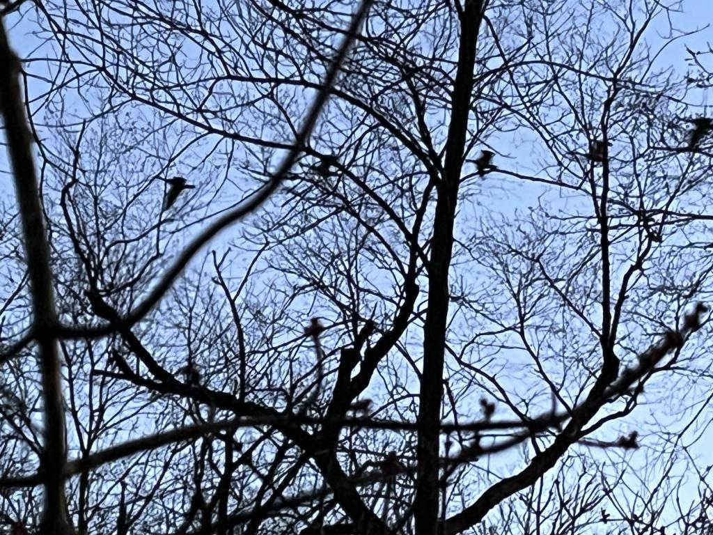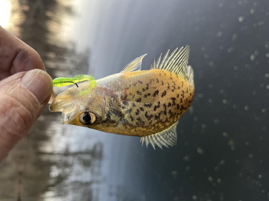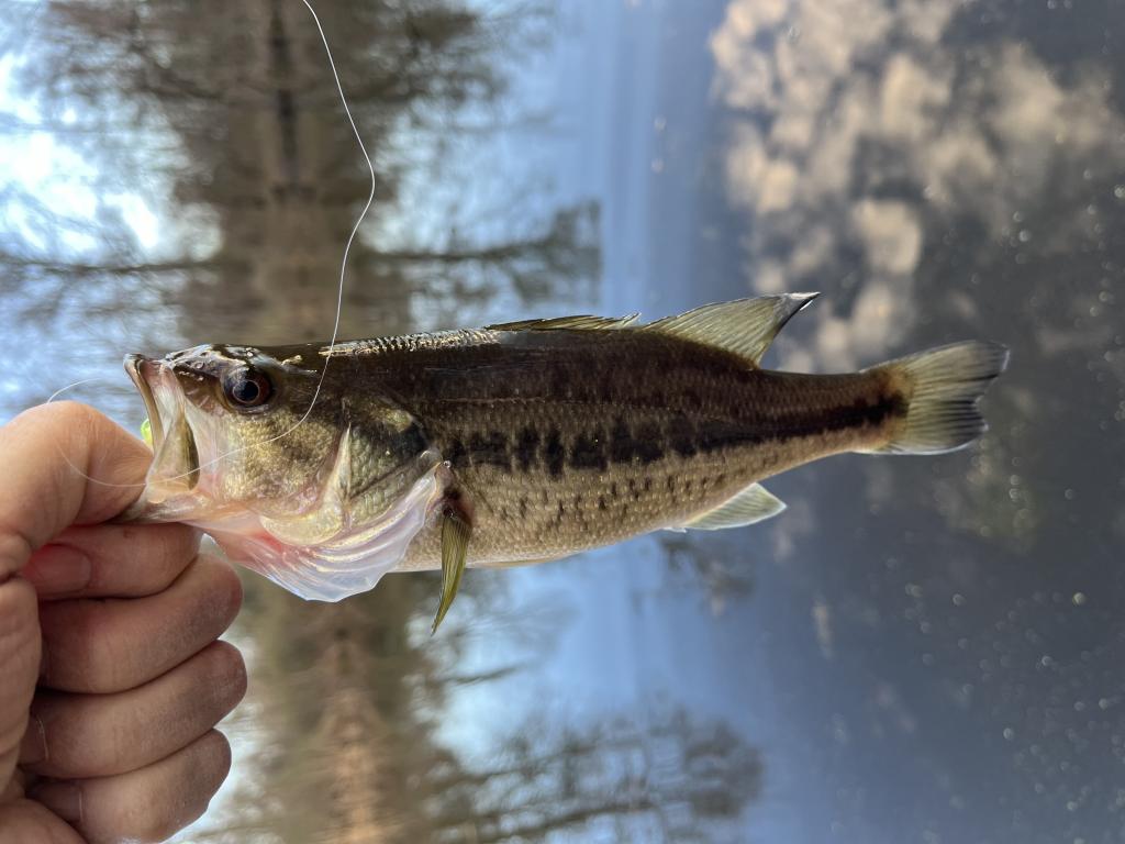 Went ultralight jigging in a 58 degree Central Jersey pond this evening on a warm, sunny day with a west wind small craft advisory. Cut a trail through the woods to the other side of the pond. Lots of small fish 🐠 were swirling. Caught and released a largemouth bass and black crappie with a small twister tail jig on 2 lb test line. Saw fish 🐟 chase my lure without getting hooked. Two beavers 🦫 arrived late in the day. Got algae on my lure on nearly every cast. Took lots of pictures. Saw many fishermen on the Trenton Marine Terminal at night. Canada geese were flying.