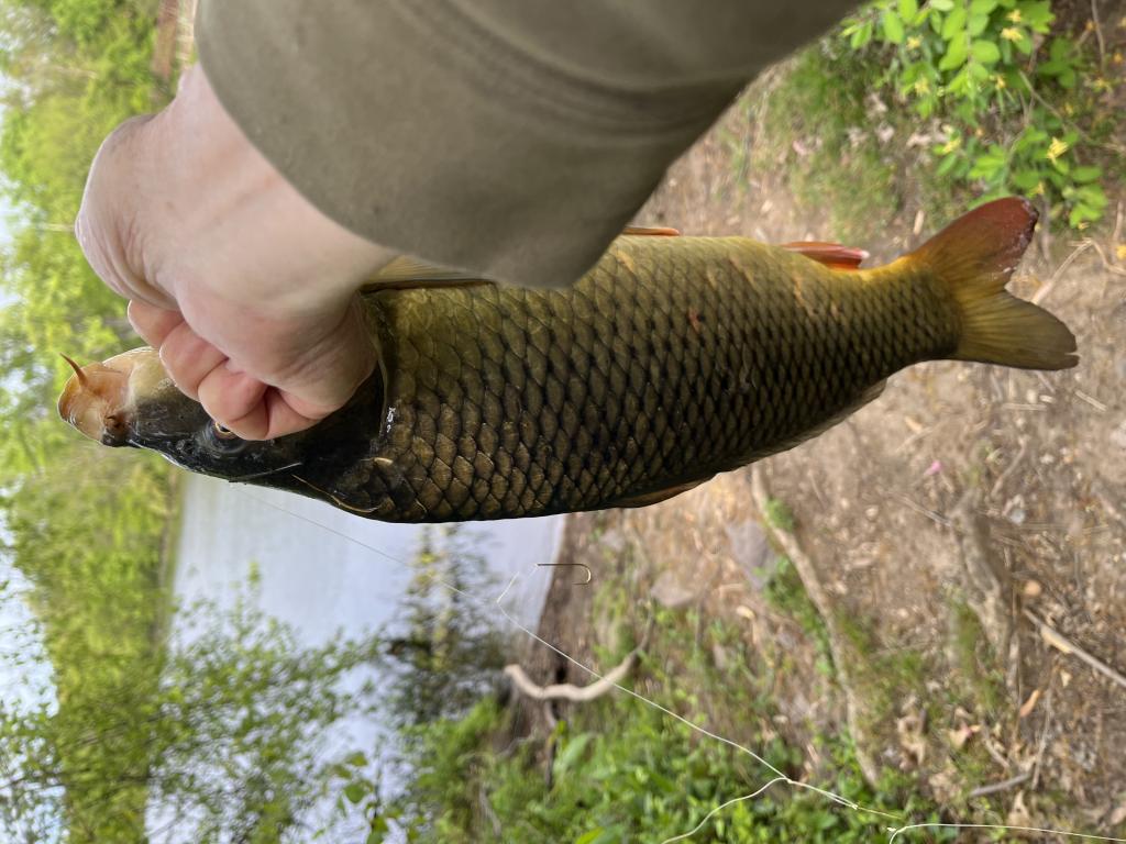 Went carping in 69 degrees Carnegie Lake this evening on a cloudy, cold day with a strong east wind. Caught 7 bluegills, 3 red breasted sunfish, a greengill, 2 common carp to 12 lbs and a musk turtle 🐢 with canned whole kernel corn 🌽. Saw a great blue heron catch and swallow 9 fish 🐠 before catching and releasing a bluegill. Caught 6 common carp that weighed 50.5 lbs the last 4 days. 3 carp stole 5 of my hooks this week.