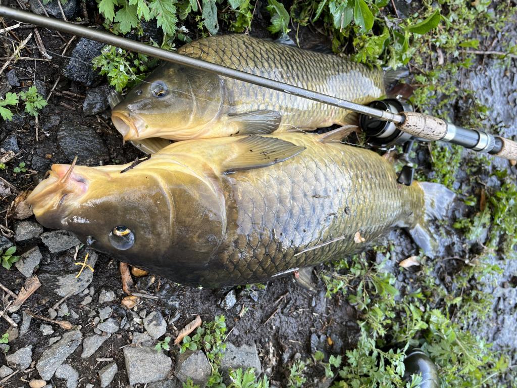 Went carping in the 73 degree Millstone River on the south shore in West Windsor, NJ, this evening on a hot, humid, sunny day with a strong south wind. Threw out corn for chum then caught and released a 9” yellow perch with a 1/32 oz twister tail jig on 2 lb test line and 2 male spawn ready milt leaking common carp to 8.75 lb with canned whole kernel corn 🌽 on 12 lb test line. Turtles 🐢, goslings, cormorants, eagles, osprey, crows 🐦*⬛, swallows, grackles, and a kayak fisherman were nearby. When I left, two fishermen were in my spot.