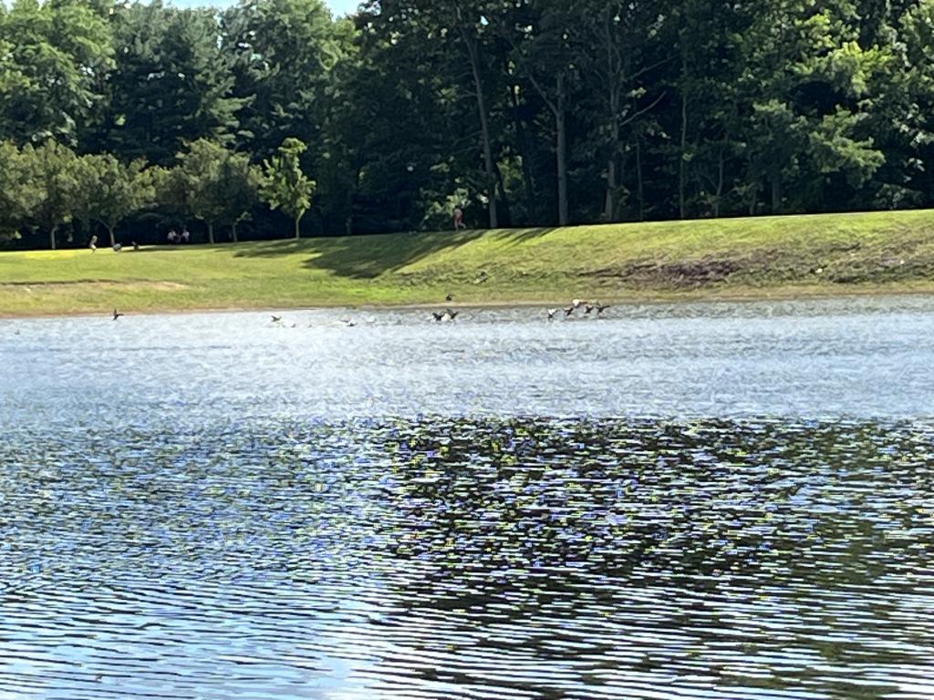 Went carping in 86 degrees Robert G Martin Lake this evening on a hot, sunny day with a cool north wind on fireworks night. Lots of people were arriving when I was leaving. Threw out corn 🌽 for chum, then caught 5 common carp, 2 redeared sliders and a bluegill with canned whole kernel corn 🌽 bait. Landed carp (32) on the last 13 consecutive days. Lots of minnows were near the shore. Carp were jumping in the middle of the lake. An adult bald eagle was fishing nearby with great blue herons and a belted kingfisher. Took pictures.