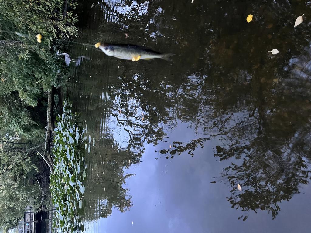 Saw a lot of squirrels 🐿️ this morning when I took my one hour walk. They are preparing for winter. News on the radio said that there is a bumper crop of acorns this fall. The wild animals are very happy. I voted for the President of the United States 🇺🇸 today. Went to the Millstone River to do some carping but too many weeds were in the water. Went carping in 74 degrees Carnegie Lake this evening on a hot 🥵, humid, cloudy day with little wind. As soon as I arrived at my spot, a mosquito 🦟 landed on my hand, then I killed it. I used a Skeeter Hawk repellent mosquito 🦟 carabiner for the first time but I killed 9 mosquitoes 🦟. It didn’t work. I threw out corn 🌽 for chum, then caught a bluegill, golden shiner and common carp with canned whole kernel corn 🌽 bait. I gave the roach to my friend the resident great blue heron. Lost a carp that threw the hook, then on my last cast of the day, a big carp broke my line and stole my hook. Saw 5 other fishermen catch a few small fish 🐟. Took a few pics.