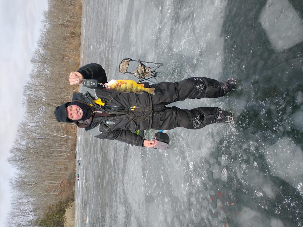 Went out with a few friends today, drilled some holes. Action was a bit on the slow side but friend Mike caught this beautiful yellow perch. 15", 1.6 lbs. Biggest perch I've ever seen, girth on the fish was pretty impressive. Congrats Mike on a PB, beautiful fish!