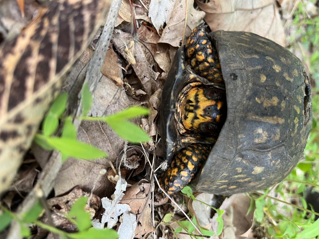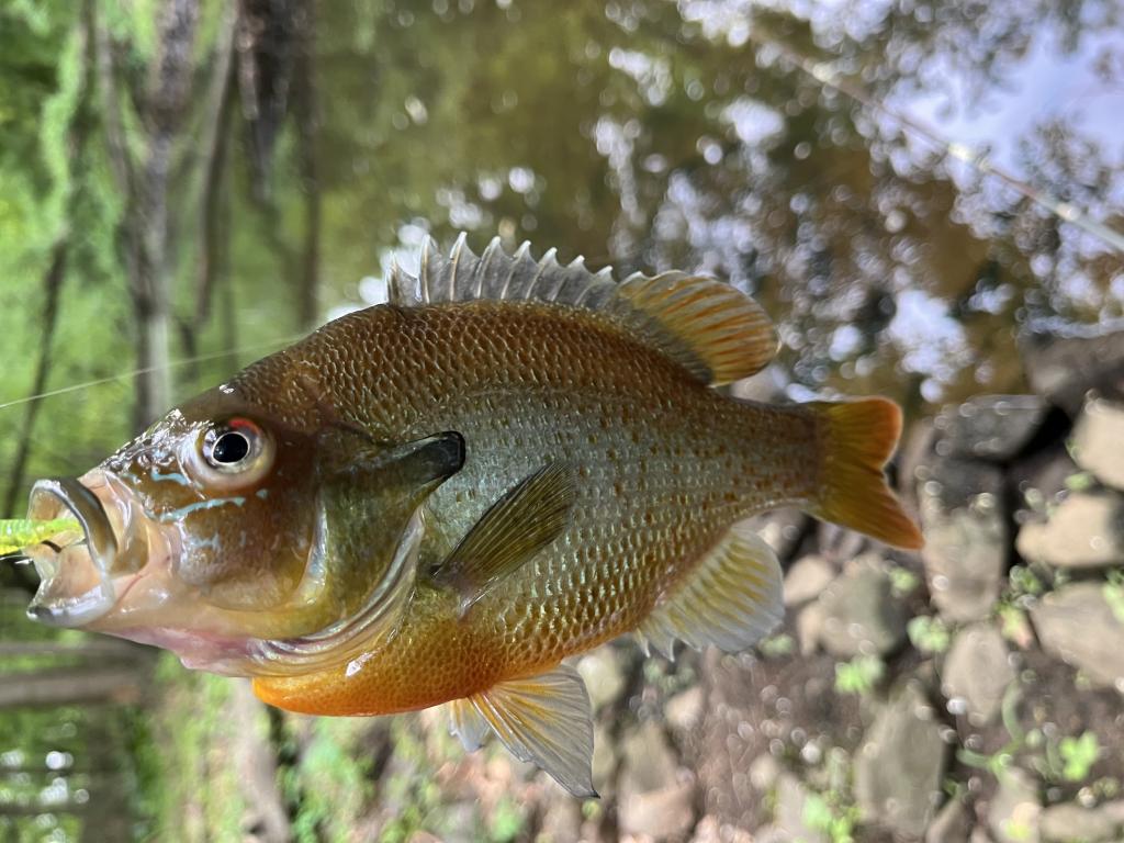 Went ultralight jigging this evening in 70 degrees Back Brook on the outgoing, full moon flood tide. Weather was sunny and warm with a strong northeasterly breeze. Caught and released 27 red breasted sunfish, 2 white perch and an 11.5” black crappie with 1/32 oz twister tail jigs on 2 lb test line. The creek was covered with vegetation. Got debris on my lure on nearly every cast. Saw a box turtle near the creek. Cut briars to make the trail usable. Took pics. Mosquitoes were biting.