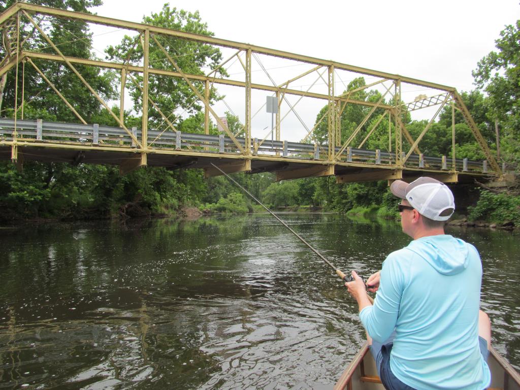 Haven't floated the lower South branch in quite some time and I'm trying not to waste any time getting out there with the new ride. Had planned Rockafellows to Blackpoint but when when we saw others launching at Rockafellows we quickly moved to a plan B and went to Three Bridges to launch. We didn't feel like playing leap frog with others today. As I was prepping the canoe my friend makes a cast and hooks up on his first cast, I'm thinking, well if that ain't the kiss of death !