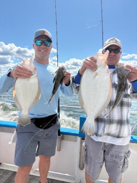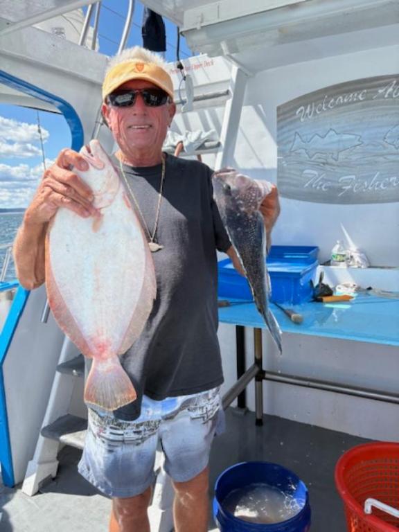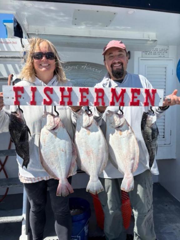 Conditions weren't the best and you needed some lead with the current running into the wind all day. Several customers landed their three, some with 2 and a bunch of Sea Bass in the mix. Water cleared up nice, read plenty of bait. Larry took the pool with a nice 4 pound Fluke.