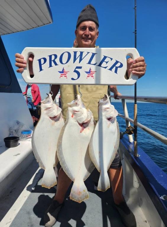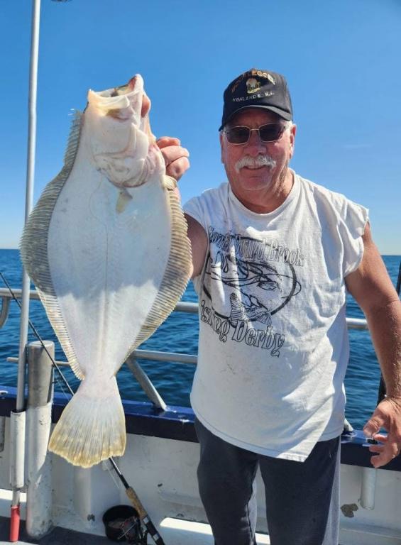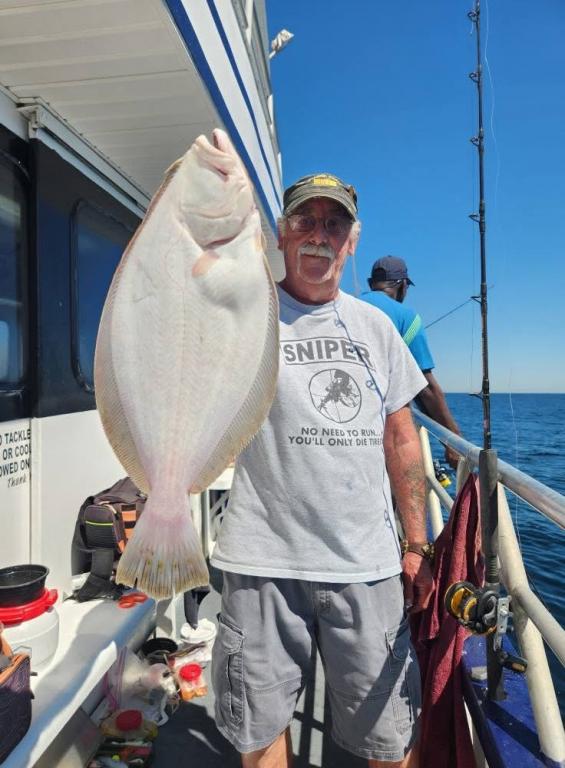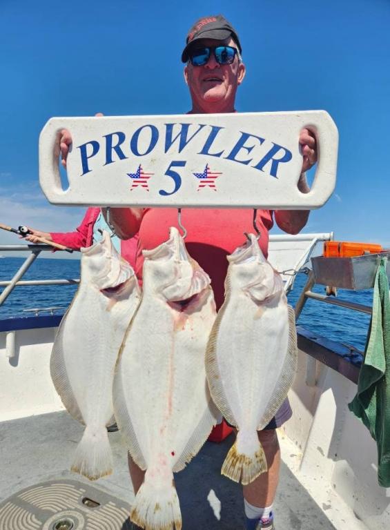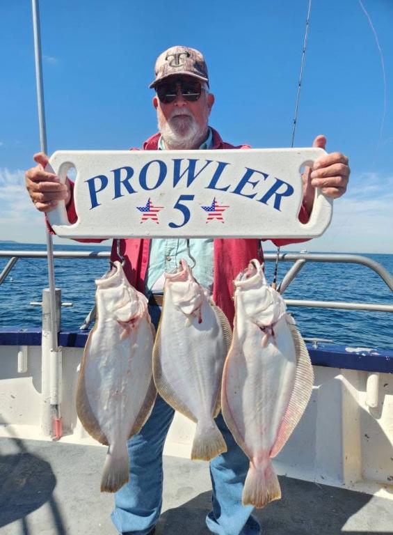 Hey gang, let me start out by saying the first thing we did was to put the flag at half mast for the events that happened yesterday and for today being 9/11. We had a nice gang of Prowler 5 regulars on this beautiful day. Although when we got out to the fishing grounds we had a big heave out on the ocean. And you know what that means - the fish usually have lockjaw. We had to work a little harder today and probably fished 11 or 12 pieces before we found the one we were looking for that had big, quality fluke on it at the end of the day. The first pic will be of Paddy and Matt with the pool fish at the end of the day. A beauty, somewhere in the 7lb. class. Have to get the official weight later when we get in. Ben, Big Joe and John had their limit and then some. Gary had a nice flattie and we had ok action on short fluke. Would have had easily a boat limit on big giant sea bass today, but they all had to go back. That always hurts. We stayed out later today to put extra fish in the boat and actually the heave was laying down real nice. Should be very good for tomorrow and great for the weekend. So let’s go fishing. Sailing every day 7:30 A.M. to 2:30 P.M. except on Mondays - we do our longer trip. Free ice for catch and fresh spearing for bait. Thanks, Capt. Scott and God Bless America.