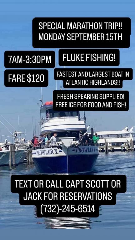 Hey gang, we set sail today with 17 mostly all Prowler regulars. The ocean was pretty rollie today, annoyingly so. Nothing like Tuesday's trip though. It did calm down at the end of the day. Our guy Freddy was high hook with 4 keeper fluke (ORL). Johnny Moon was today's pool winner somewhere in the 6lb. class. He had 2 nice keepers and Frank had his 2 nice keepers also. Dan also had 2 nice keepers. Regular, Gary, had a nice flattie. Some did better than others today. Mr. and Mrs. Kim only had 1 keeper and they are both very good anglers. We stayed out a little later today and ended the day with 13 or 14 keepers with decent short action in the mix. Tomorrow, the ocean looks perfect. So let's go fishing. 7:30 AM to 2:30 PM; fare is $90; free ice for your catch and we supply fresh spearing. Don't forget about our marathon trip, Mon., Sept. 15th. Thanks, Capt. Scott