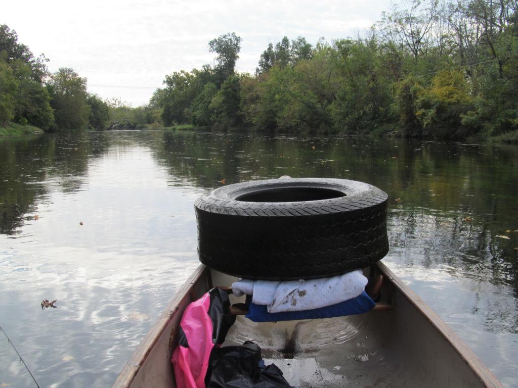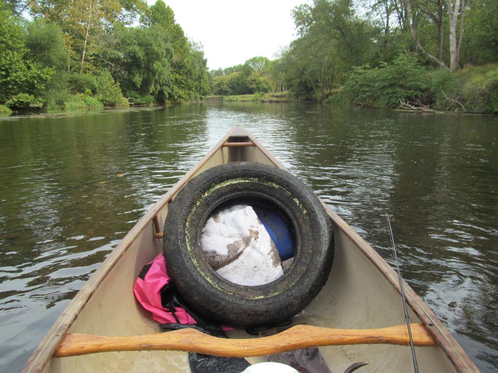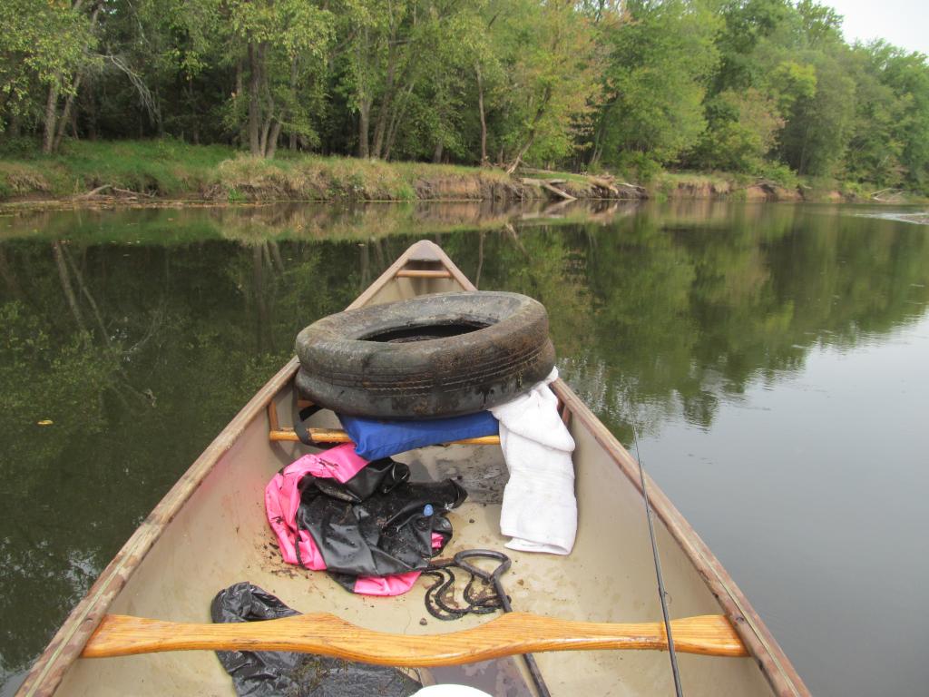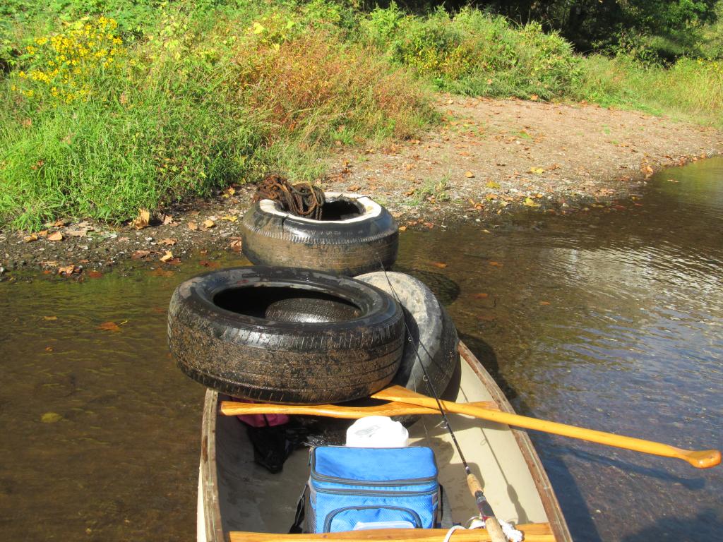 I took my time in the beginning working as hard as I know how throwing my Keitechs. Leaves and weeds were a bit of a PIA but kept fishing. Got down to Three Bridges and started pulling tires since the fishing was slow in the low gin clear water. What I failed to realize I needed to be doing something since I really hadn't gone that far in almost 3 hours... PADDLE !!!! With the lower than usual CFS I was going nowhere fast !!! So I battened down the hatches and dug in for an almost 3 hour non stop paddle. Mind you I enjoy the river, just don't want to be out there all day. That trip usual only takes me 5 hours, I dug in and did it in 5 1/2. I barely slowed down when I saw a tire. Jump out, dig it out, toss in canoe and keep going !!! I think I banked 8 tires today but had to leave 8 truck tires behind, I can't do truck tires by myself.