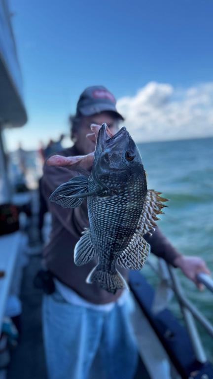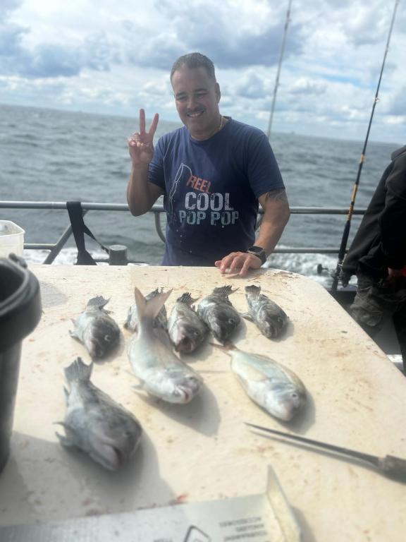 Hey gang, we had a nice crowd of customers again today, 28 people. We were all fired up and ready to go get ’em like we did yesterday. I had the 3 deckhands working deck. I was able to even get a couple of bushels of green crabs for today’s trip. But, it definitely was not like yesterday’s catch. The average was 5 to 6 to 7 keeper sea bass per person with Linsey being high hook with 18 keeper sea bass and she released a blackfish. She out fished the guys again today. We love having her aboard, she’s awesome. We did have a southerly breeze that came on pretty good in the afternoon that we never like to see because it makes the water colder. The total was 190 keeper sea bass, some really big porgies and no keeper blackfish, just shorts. We fished with fresh clams and green crabs. Had some great people on the boat today. They seemed pretty happy getting off the boat. Saying thanks Cap. we’ll be back. Our next trips will be Friday, Oct. 10th and Sat. Oct. 11th. We’ll see you at the dock then.