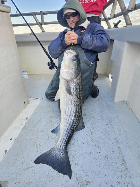 Got to the dock with Grandson in tow to a cold west wind and a light crowd. Capt. Mike was at the helm and Capt. Bob jumped on to fish! We turned north to see increased winds and bird play. On the first drift a customer hooked up in the stern. This fish ran up current and pulled drag bending the rod to max load. The customer hammered the drag and pop went the line. I thought that we were in but the fish had other ideas. We read huge balls of bait with bass underneath but couldn't get them to commit. We kept moving hitting readings and bird schools. The wind was moving us at a good pace and it was cold! Caden drew first blood with a 40+"er on an Ava 47. Capt. Bob came over and fished with us . He dropped a line puller after a couple minutes on a gold hammered diamond. I caught a Dogfish. Grandson and Capt. Bob caught big Sea robins. It was getting tough to stay at the windy side rail. The cabins warm interior and hot coffee called between drifts. I had go put my slicker coat on to break the wind. Grandson caught a Dogfish and I caught a 14" Fluke. The horn sounded and Capt. Mike took a long ride south. We stopped on ink blot readings with bass under them with bird play. I went to the sunny side of the boat with Capt. Bob and Capt. Mike. I changed to my Kunan rod and jr. Jigmaster with a naked silver ava 47. Capt. Bob caught 2 large Stripers in quick succession. Saw 2 fish broken off and had one nudge. Fired out a long cast almost matching Capt Mike( he always beats me) I was talking to Mike about 10 turns in and I get bit. I didn't swing and just kept reeling until the Kunan loaded up and I was on! I had a real one on this time. She headed towards the bow unlike Capt. Bobs who went under the boat. After a few minutes she turned and came to the surface. Joe netted her and Chris measured. She was 40 1/2" long . took pics and back she went. Capt. Bob was doing battle with a slob with a couple others fighting fish on our side and a couple others being netted on the other side. I started to catch Mackerel on the next drift. We probably had a couple dozen for the trip. The wind finally started to lay down a bit as time ticked down. Capt. Mike headed towards the inlet but didn't sound 3 horns. He had his eyes on some thing north of our inlet. We stopped and it was game on . I got bit 3 or 4 times only having 1 come tight for one run. Thought I broke my hook. There was a mix of keepers and overs. Mike stayed out a little over for this late bite.