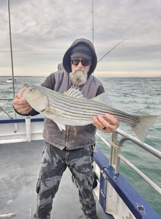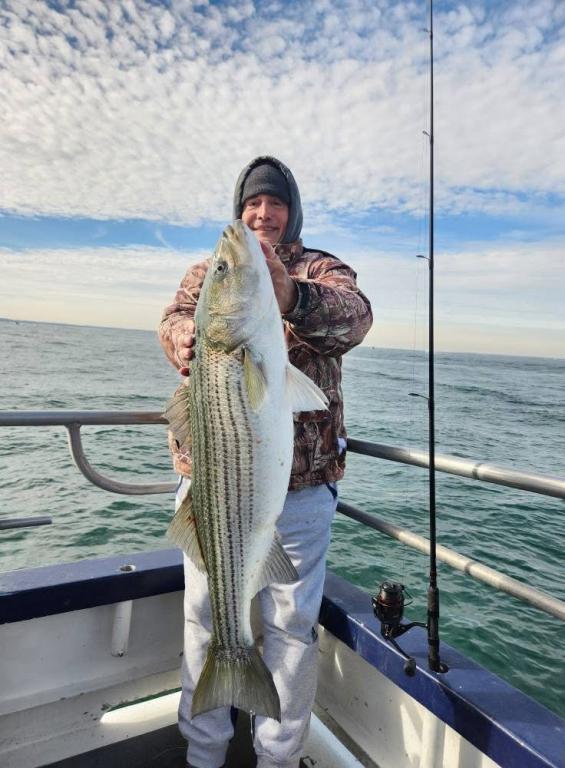 Hey gang! We sailed with a nice crowd of customers for a gorgeous Saturday in mid November. We put the peddle to the metal and flew out to the grounds first thing this morning. We knew the boat traffic was gonna be horrendous. Our best fishing was in the morning, we got a good shot of a striper blitz's and we slugged away the rest of the day. Ryan fishing the bow our Philly Eagles guy was high hook with 10 Striped Bass caught ORL. The highlight of the day was Ben winning the daily pool with a Monster Striper at 41-1/2 inches. I don't know how he dose it, but he wins a lot. Probably cuz he fishes everyday and is a pretty darn good fisherman. Here's a few pictures I took today. Captain Next trip is Nov 18th Tuesday. So get the warm layers on and Let’s go fishing!!! Sailing 7:30am to 2:30 pm. Thanks Captain Scott.