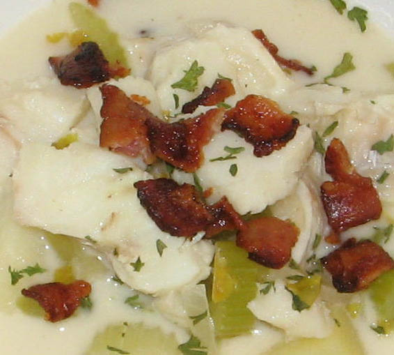 For the stock cover ingredients below with salted water (1-2 tablespoons of sea salt) IN 6-8 qt stock pot Should make about 3qts of stock. 1 5-6lb cod rack and head.(no guts) 1 bag of soup greens (food town veg section)parsnips,celery carrot,dill parsely ect 1 Medium Yellow Onion Cover with salted water boil(simmer) for 2 1/2 hours when done strain off over cheese cloth in another pot. Discard remains. MAKE THE CHOWDER 6 strips of bacon (cut in 1/2 in peices) 2 lb-1 1/2 cod filets cut in 1/2 in-1 in chunks 1 cup of white wine (any) 1 cup of heavy cream (MIX THE SOUR CREAM WITH THE CREAM) 1 pint of sour cream (this is the trick) 6 youkon gold potatoes 1/2 in chunks) 1 lg yellow onion (Diced not too small) 6 stalks of celery (1/2 peices) In a large sauce pan or 8qt stock pot cook the bacon when crispy remove from pan put on paper towels. set aside. Leave 2-3 tablespoons of bacon fat in the pan or pot. Cook the onions till translucent don't brown too much. (5minutes) When onions are done add the cream wine sour cream potatoes and celery and fish stock. Bring to a boil and simmer (15-20 minutes) Add Cod chunks..Bring to a boil and shut off. You are done. Serve with Bacon on top and chopped parsely. Salt Pepper. ENJOY!! You can sub low fat sour cream and Milk, turkey bacon ect if you can't eat the fatty ingredients. I only have it once or twice a year so here's how I like it. You can also use clam broth or chicken broth if you don't want to bother with the stock. Also you can throw in a small bag of frozen corn if you like and sometimes I use carrots YOU CAN ALSO MAKE THIS WITH BASS... REALLY TASTY Leif |