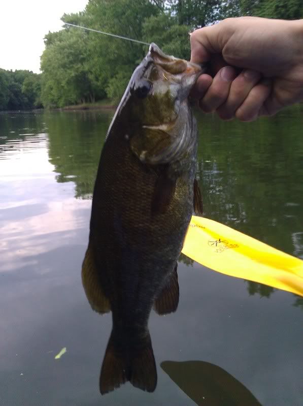Decided to stay local today and throw the kayak in the Pompton River for a little bit after work today. Got on the water around 6pm and had some luck. Landed a few Smallies, the biggest being about 17" (see picture). Also landed a Rock Bass, a few Sunnies, and a Yellow Perch, all on a 4" wacky rigged Senko.