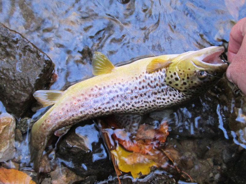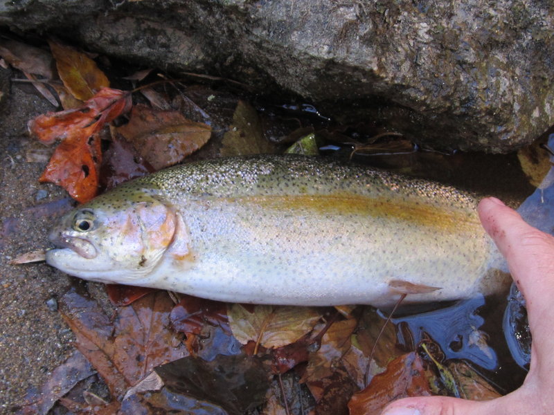Decide to hit the south branch today and see whats happening,lots of leaves and a few nice fish.Fish were deep and spread out but very aggressive ,tried lighter colors first but no love love switched to black and thats what they wanted picked up 4 bows to 22" and a holdover brown.The big bow was camera shy I was trying to get a good pic and away he went.