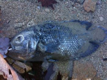 Crazy as this is to say it looks like a tilapia? Way to round and colors do not match up with those little red eye rock bass. Maybe a pet that was let go and died due to the water cooling down! Just my thoughts!!