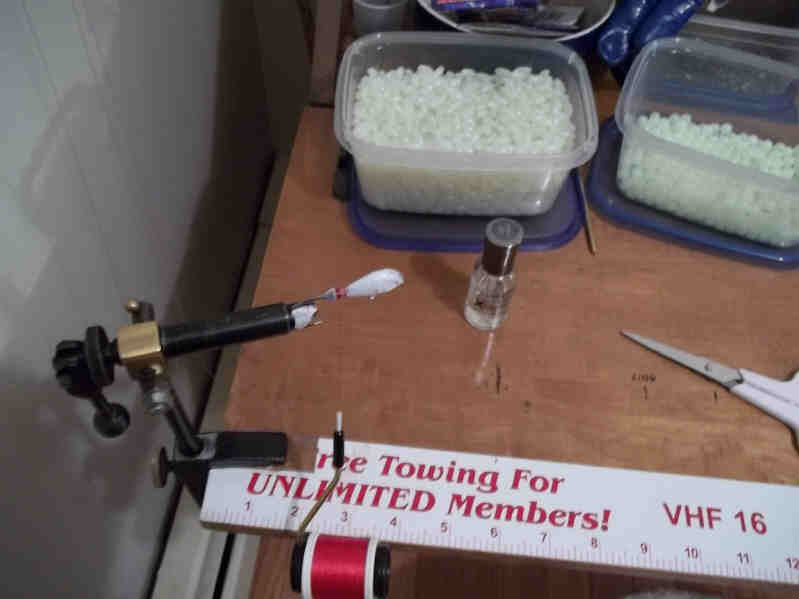 Materials 1 Buck Tail (Deer or synthetic) 2 Vice (Rotary Type) 3 Tying Thread 4 Bobbin 5 Nail Polish, Crazy Glue 6 Mono Loop (15# test see pic) Getting started first you need to select the tail and color, I used white. Place the jig hook into the vice wrap the base with at least 15 turns of thread.Coat this with either nail polish or crazy glue, let it dry. While waiting get the hair ready use small amounts, building the tail up till you have covered the hook. Finishing wrap over the loop you made, this is easier then using a whip finisher. After pulling the thread thru, clip the end close. Now you can apply the nail polish I recommend 2 coats minimum the jig in the pic has 3 coats. The thread I am using now is Coats & Clark Embroidery Thread, 1100 Yds. 40 Wt.100% Polyester. I use a drill to wind the thread onto small spools to fit the bobbin.. Hope this helps, see Sam for them unfinished jig heads, tie your own and catch some fish. Have fun Richie