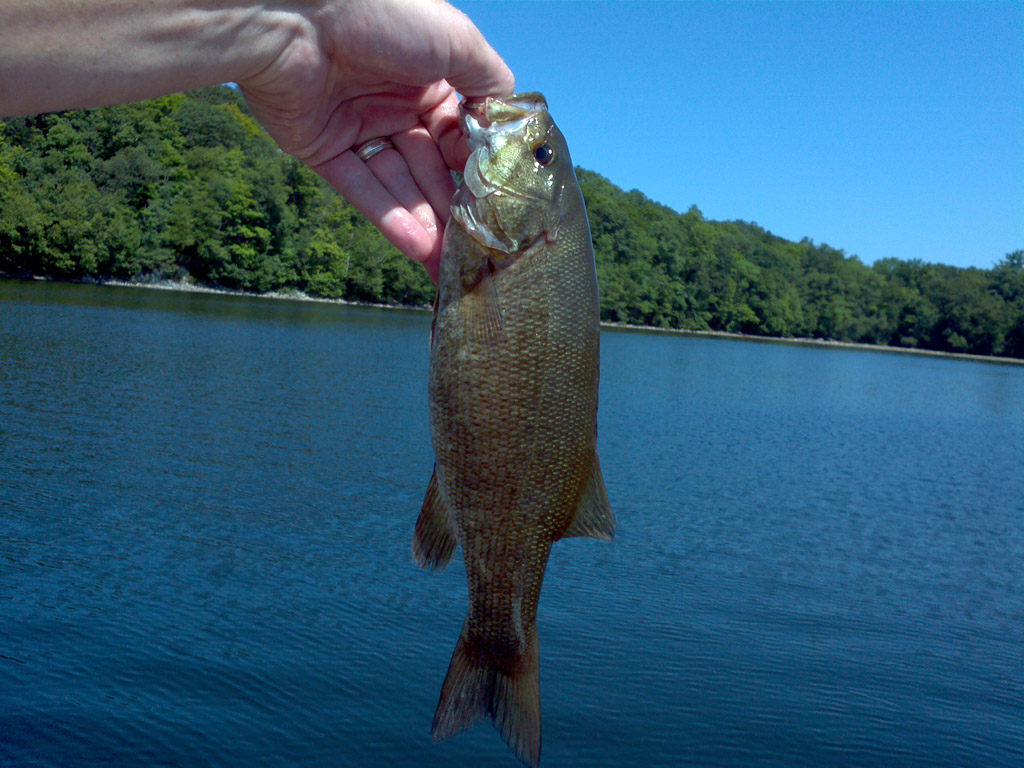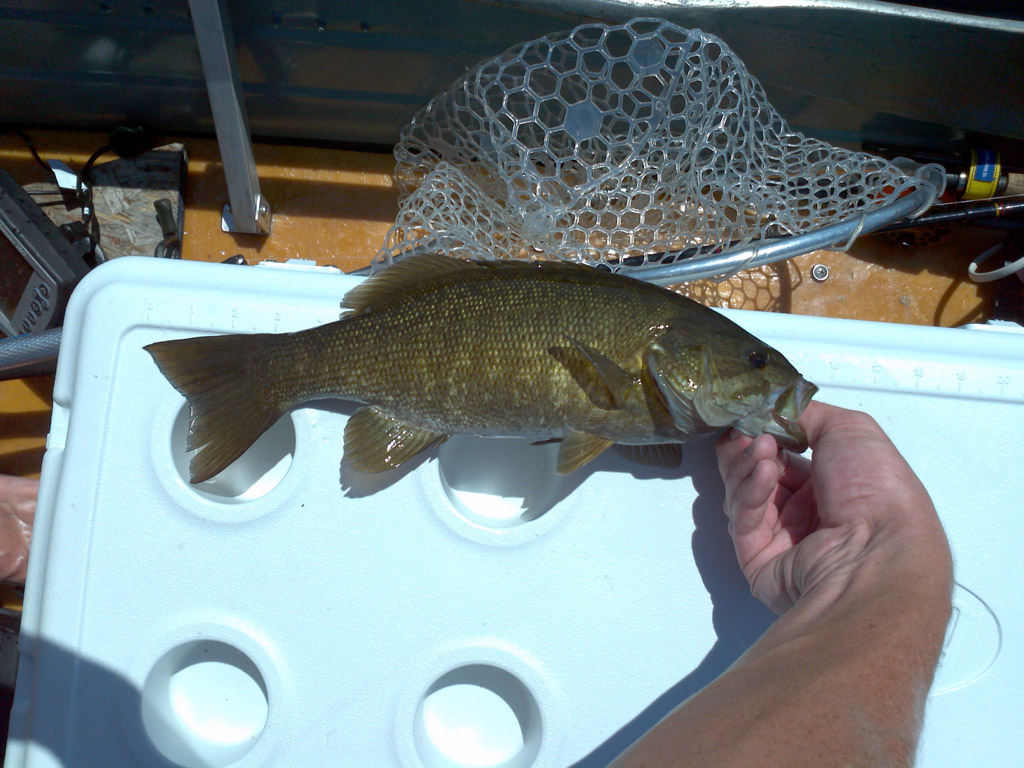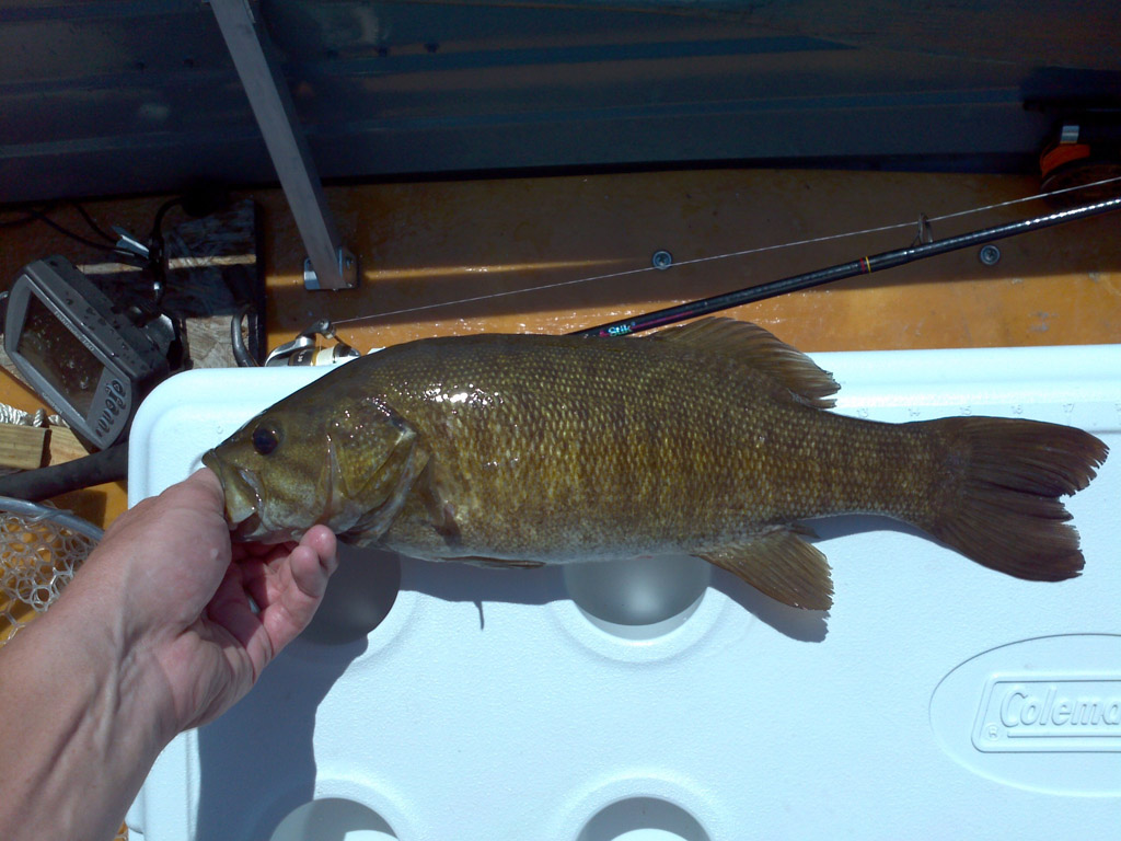 I cruised around a bit and marked a few fish with the sonar, but nothing was really biting. Worked the drop offs around the edges with no luck, except for a few sunfish and some short smallies to 10". Around 10:30 I decided that it was time to go big or go home, so I headed out to the center around 40 FOW and double anchored. I set up two rods, one with a slip weight to get the herring down to whatever depth I want and another with just a hook for live lining. The drag on the weighted rod was barely tight enough to hold the sinker weight and the live line rod was open bail. Had a few fish come through as I was waiting but nothing took the bait. Around 11 I decided I was calling it a day and would start heading back in to the dock. The wind was blowing pretty towards the launch, so I put out my drift sock and set up a drift to see if I could connect with anything on the way in. About ten minutes later, there's a nice ZZZZZZ from the weighted rod's drag. I grab the rod and palm the spool while I set the hook, then tighten the drag down and finally have a good fight on as I bring this decent smallmouth in. ![]() A little while later, I noticed the rod tip of the deep rigged rod bouncing all over the place, so I picked it up. Nothing on yet, but the alewife was going nuts. On the sonar I could see that it was swimming so hard it dragged the one ounce weight from about 25' to 20' of water. I gave the rod a shake and the sinker pulled the bait back down into the depths, but the alewife was still going crazy... until my drag started peeling off like mad. Set the hook and it was game on. The fish went on a couple real nice long runs when I almost had it to the net, but eventually I was able to land it. ![]() About 18", I think that's a PB for me Kept at it and kept catching smallie after smallie on my way in. The live lined herring were cruising around just under the surface, so when they got hit, it was accompanied by a nice big satisfying topwater splash. Another highlight of the day was a double-header when I came through a school of bass and both rods hooked up at once (somehow landed them both) ![]() ![]() ![]() ![]() ![]() Almost at the ramp had one last hookup with what turned out to be a 13" yellow perch! He was gill hooked and christened my boat with a shower of blood, so I guess between that and netting some big fish from it the restoration is finally done ![]()
