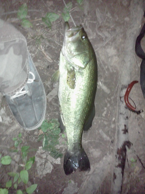 Fished between Clark Reservoir and Milton Lake last nite from 7:15 till dark (not very long). Took a handful of casts w/ a 5" inch senko in pumpkinseed color and landed this lil' hawg. The fish measured about 17" or so inches. I'm a size 11 so the timberland boot in the picture should help give it a base for comparison. I left immediately after I released her as I was more than satisfied with the one fish. Catch em' up.