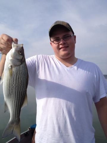 Had a feeling the bite was gonna be on today with a front coming in so i woke my son up loaded up the boat and off we went later than i wanted but none the less we were off. Stopped at Lebanon for some herring, felt bad for the guy behind the counter cause he had a line of anxious fisherman in a hurry, but eventually we were on our way again. I said to my son "I GOT A FEELING TODAY" and his sarcastic reply was "YOU ALWAYS GOT A FEELING!" as we launched. I guess i was right cause not even five minutes after the first herring hit the water my son had his first ever hybrid on LOL!!!