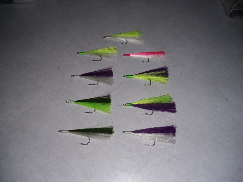 Now making and supplying Synthetic hair teasers in dual color combinations. Currently being made with 3/0, 4/0 and 6/0 size hooks and in a wide variety of colors. These jigs last and hold up to the toothy species bite. The jigs were field tested in Canada, Upstate NY, Cape Cod, the Jersey Shore, the Outer Banks and in Florida, and have produced a variety of species caught from Flounder, Fluke, Trout, Walleye, Sea Bass, Grouper, Red Fish, Snook, Stripers and others. Stock up now for the upcoming Fall Striper run and Fluke season next year! Introductory pricing offer of $3.50/6 pack.