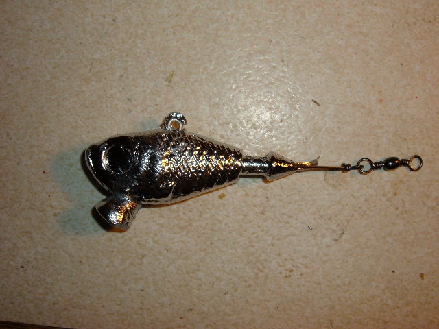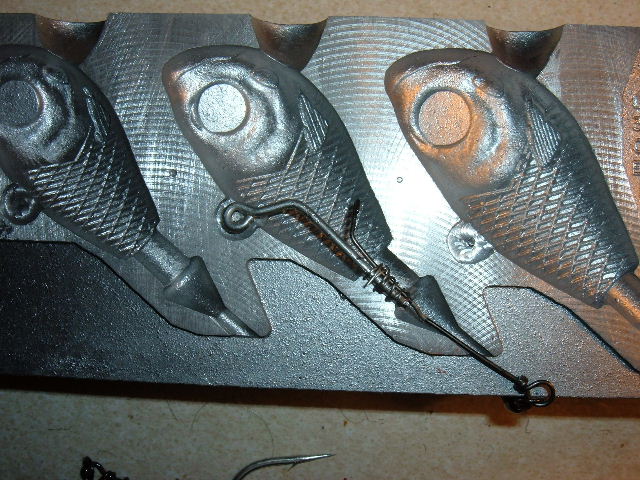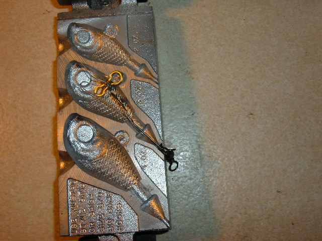 I cut the hook off a jig hook, straightend out a snap lock #3 (mine had a swivel) and wired them together. Should have left a little less of snap outside mold. Problem solved. Easiest way to cut hook is with the edge of a grindstone. Opened up the eye of a 4/0 hook with a fine nailset to fit over swivel and closed with pliers. This is a 6 oz jig.