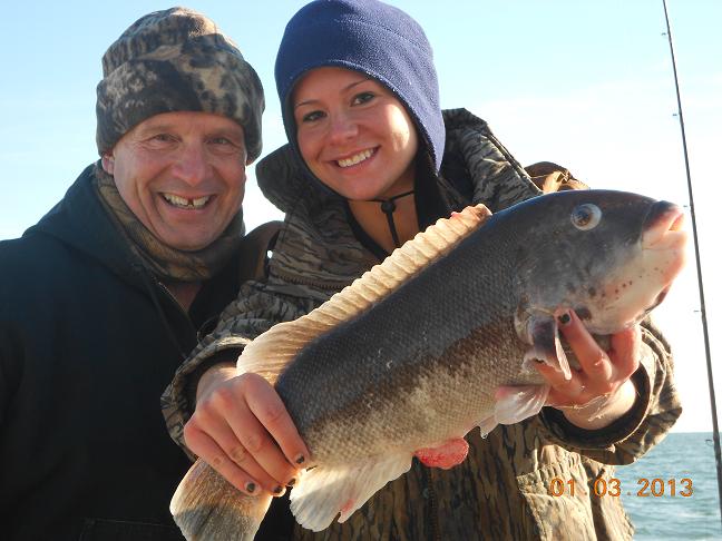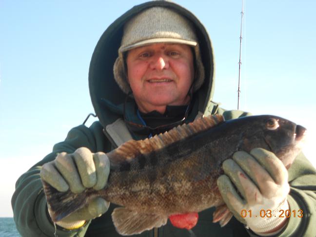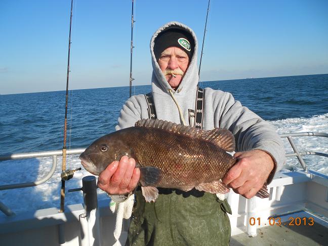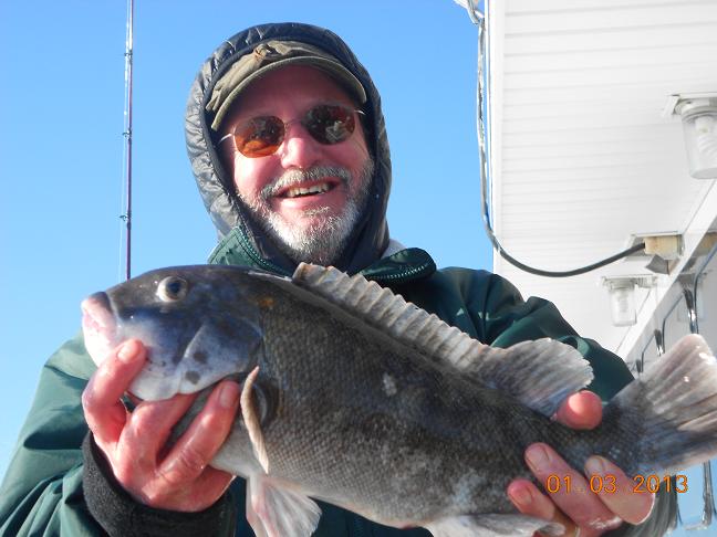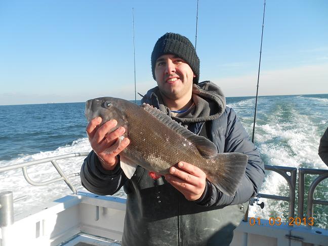 Hey gang, Capt. Scott here. We were the only boat to sail out of Atlantic Highlands today, we have 10 people. We're catching some nice tog on green crabs and white leggers. Some limits as well. Today's pool winner was Tom Loheide of Leonardo, NJ with a 5-1/2 lber. I'll post a few pictures later this eveing. Other than the cold, it's a nice sunny day and a very nice day out on the ocean. We'll be shaping up everyday. Weather looks pretty good coming up. P.S. Heated handrails, green crabs supplied, white leggers available for a fee.