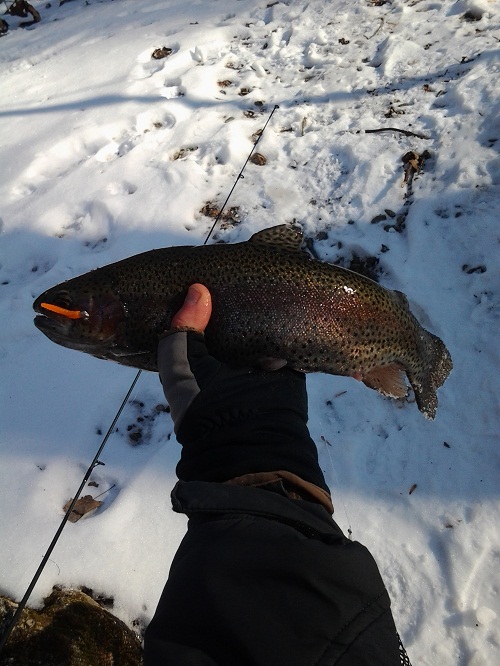 Renewed my license and headed to the gorge for a full day of fishing. Was slow for the most part, but still glad to pick up my first fish of the new year, a 14" bow on the usual...