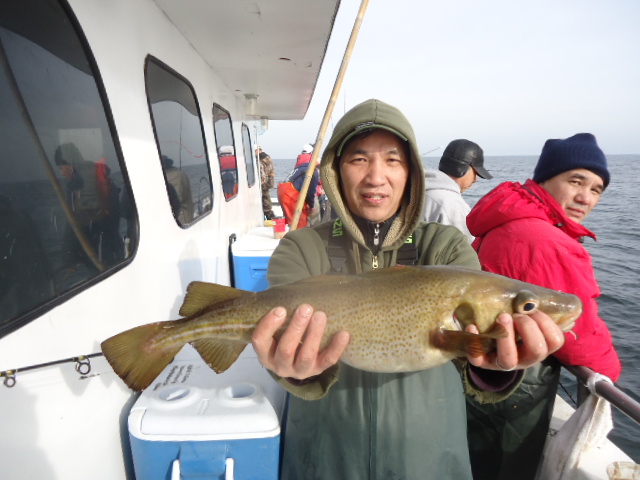 1-9-13 Flat calm,,,all day long..Have not seen that in a while....Fishing was good again today,,real nice ling fishing for a large crowd who came out to enjoy the nice weather..Guys who were dialed in with the right rigs had no problem pulling on the ling most of the day..Bob Korsen and some of the other guys up front had no problem catching 20-25 ling.Most averaged 10-15 and some struggled a bit but still had fish..Again gulps outfished the clams...Mixed in with that we had some real nice keeper Codfish,,,couple of people even had two keeper Cods to go with the ling...And to top it off some nice Pollock came up as well including a Jumbo that went about about 20-25 lbs.I would guess...Again a few keeper Sea Bass,,and I dont think any keeper Togs today...See ya tomorrow...Check out some nice pics..