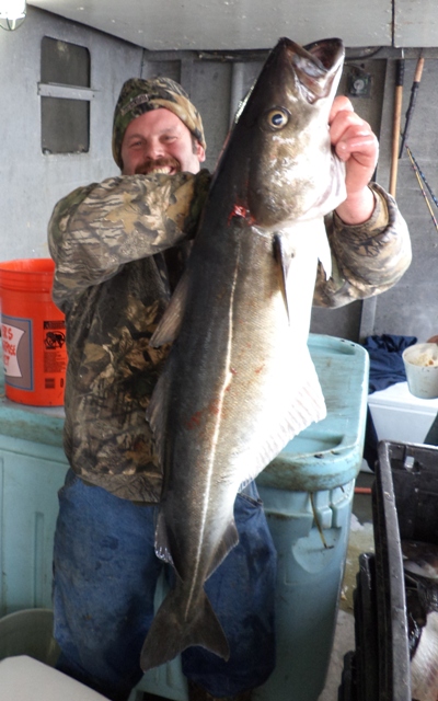 Chris McQueen from Rockland NY (FDNY) with a 35LB Pollock, his limit of sea bass, a limit of bluefish, and a few porgies.