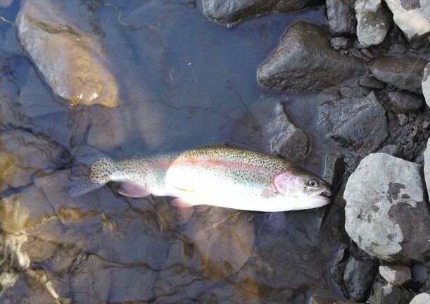 Hit the Musky 1 to 4 and got this nice rainbow about 18 inches. I also hook into another fish about the same size, but the drag on my reel screwed up and it got off. (Bummer). Fished the lower end with a egg tipped with a meal worm I got from the pet store, they have giant meal worms but I was using regular.