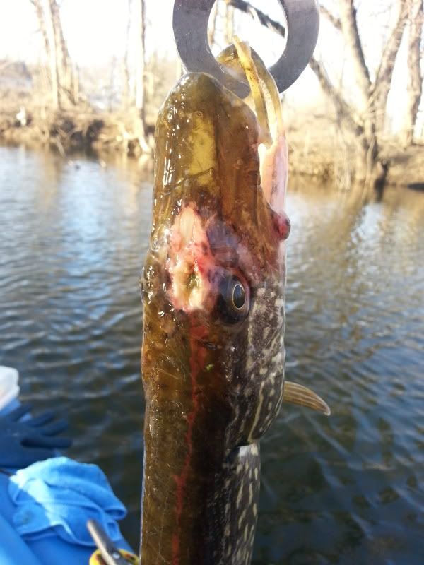 Wow, looks like a gangster Patterson Pike. Must have been in a Pike gang brawl. Either a bigger Pike or some crazy bird got its talons in him.