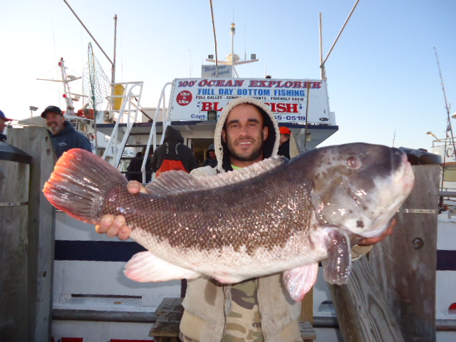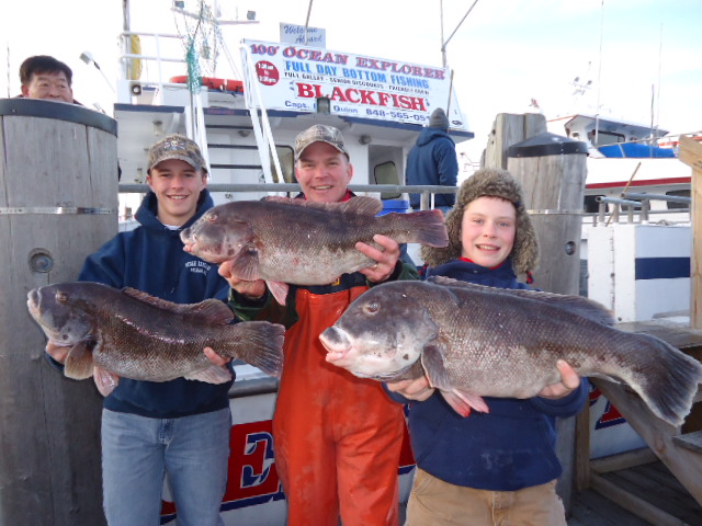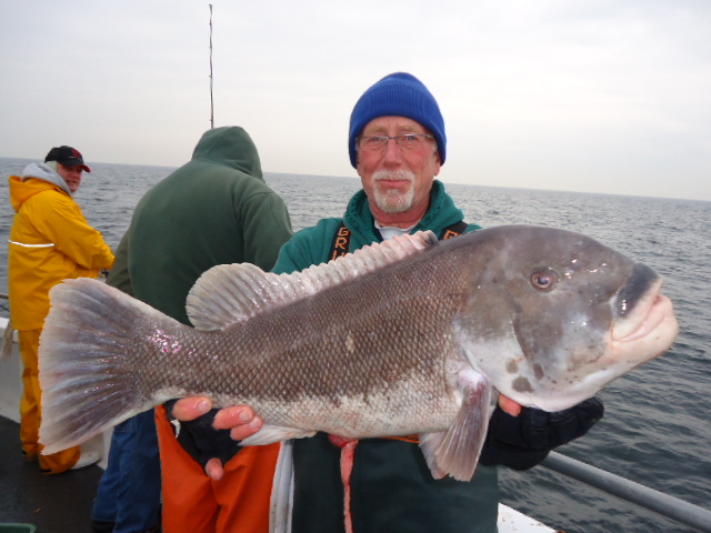 Generally this is the time of year when we see our largest blackfish come to the net..Last year fishing the 120-160ft.range produced some large Tog..The biggest went 17lbs.and I know we busted off some larger ones..Quite a few fish also in the 14-15lb range.We still have crabs on board for the blackfish and we have been doing well with the Ling and Codfish as well for those wo want to fish clams or actually the gulp baits have been outfishing the clams,,even had keeper Togs on the gulp..The first picture is the one to beat in this new year...17lbs and some other nice ones well into double digits..We are not out today,,,the cold kept most at home this week but tomorrow we are looking warmer and will be back out.Winds look decent as well..Any questions give me a call....See ya tomorrow...
