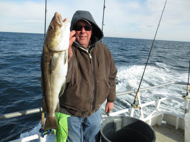 It was a nice ocean after all the West wind but it was cold all day with ice forming in your guides. A strong southerly current walked 10 oz sinkers and hurt the fishing We didn't put much in the pails on the first 3 drops. Our last drop in 130 feet was our best with a good bite in the bow on tog however 4 out of 5 where short. Mike had our only cod and he took the pool with it. There were more ling than we have seen but still not good.