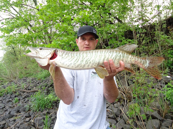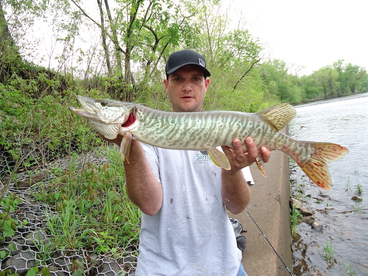 Worked half a day today after getting 3 hours of sleep last night after fishing LH. Saw the rain and got really happy, said to myself, its time to hit the river. Got to the spot around 1230 and was greeted by Mark yet again, good to fish with you my friend. Go get em tomorrow! Started launching smaller lures and came with a 25 inch pickerel at the rocks. Nasty bastard bit me on the release so I threw him in the water without a pic. He was pretty fat. Mark had left and I started throwing bigger lures when I noticed the water coming up quickly. Soon after I tied on the jointed Rainbow Trout Bomber I got into a good battle with a fat 31 inch TIGER MUSKY. He jumped, he pulled but finally I got him in. What a great little fight. Shortly after that a LM smashed the 6 inch lure. He was about 2-2.5 or so. Kept casting and casting as the water level rose, hooked 1 more fish in the white water at the falls. Stopped my lure, paused for a second or 2, realized it was hooked and took off like a freight train. Came unbuttoned by the fish ladder wall. Actually I think the train HIT the wall Well if you dont know kids, that train was a Striper without a doubt. It hit the same lure I got em on last year. Great day on the MIGHTY RARITAN! YEA BUDDY!!! TIGHT LINEZ!!!