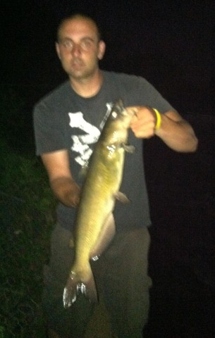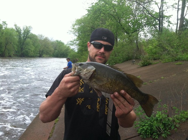 Hit the falls last night from about 8-10 looking for a nighttime walleye or striper with Gatto. Nothing going on until about 9 when Gatto hooked a 4lb channel cat on a rapala. Thought we had a big walleye until we got it up to the wall and realized it was a cat! Went back this morning around 9 after the rain last night and Fasteddie was already hard at work down there. Tossed lures and talked with Eddie for a while then Gatto showed up out of nowhere lol. Not much going on until I hooked up right along the wall with a nice smallie that went about 3lb on Eddies scale. A few minutes after I got the smallie back in the water Eddie comes walking past with his pole bent in half and another Tiger on the other end! He fought it down to the end of the wall, got her up, I snapped a quick pic and off she went. We all had to pack it up shortly after that, but it was a good quick day down at the falls. I found out FE personally raises and stocks the Tigers there, thats why he catches them all LOL!!! Might head down there later on, I need me a damn striper or walleye and the water was almost at the perfect level when we had to leave. TIGHT LINES!!