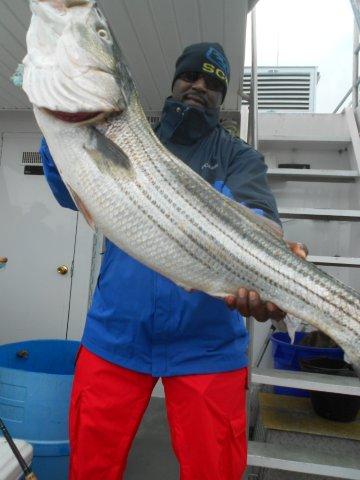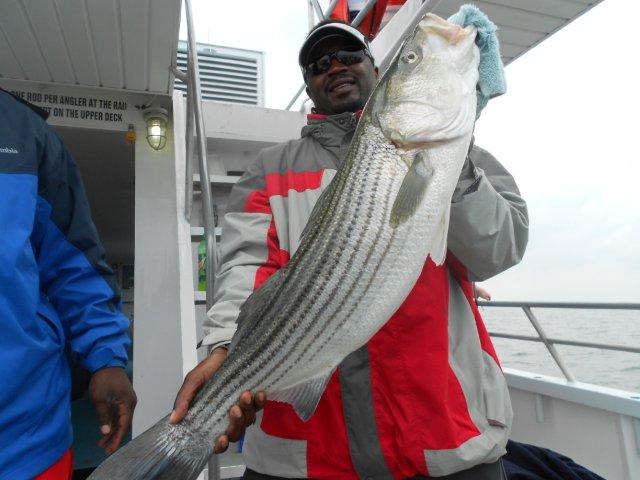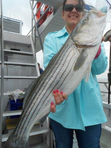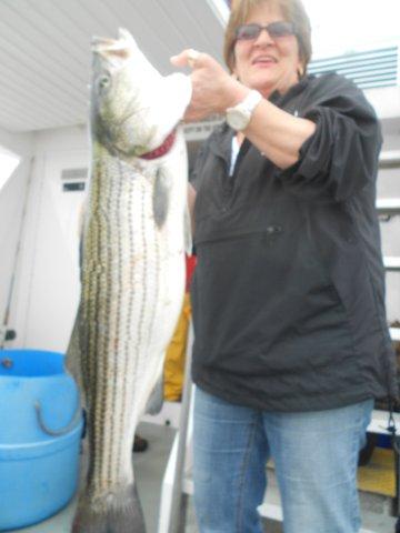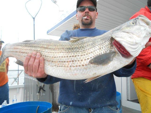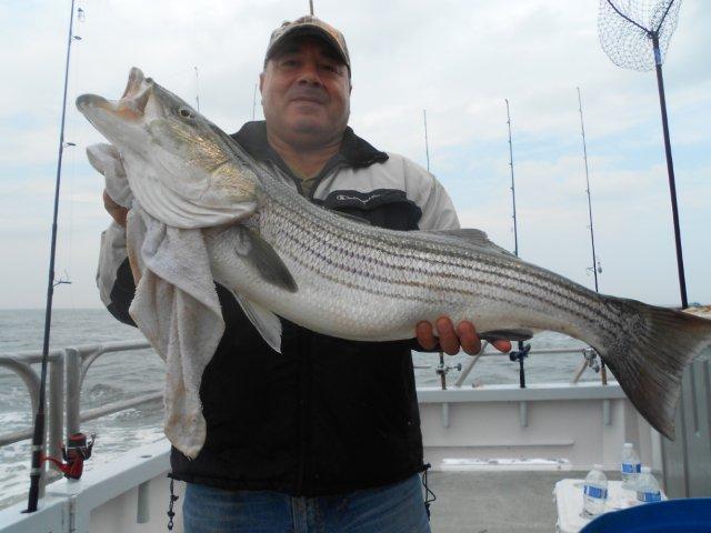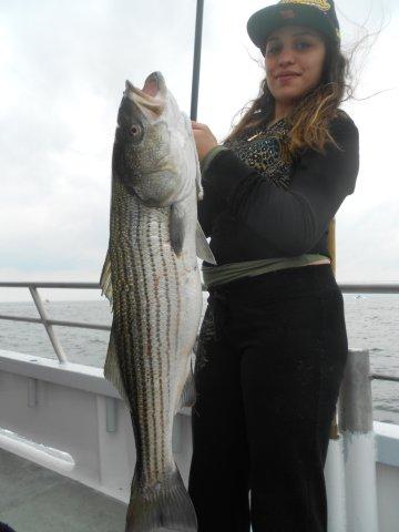 Hey guys, Rob here. Well today was another day of good bass fishing for us. Not the great fishing we had last week but still good fishing. We caught fish right from the start this morning, then it died off for a while. After the tide change it came on strong! If not for the dropped and broken off fish we would have been over the limit for the boat! Good job by most! Gary Yacavino from Hoboken, NJ. was our pool winner today. Great job Gary! Arielle Napolitano from Old Bridge, NJ. caught her first Striper ever going 19 lbs.! Welcome to the sickness!