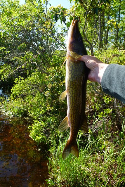 I was using my trout outfit: 4 lb test, 5' ugly stick. A good battle. Kept taking drag. Took a #4 panther martin on a 6" steel leader. Caught another 20 or so all under 14". Zero day for other fish - no perch, bass, crappie or sunnies. Sunny beds were abandoned. I guess the last few cold nights had fish retreating to deeper water.