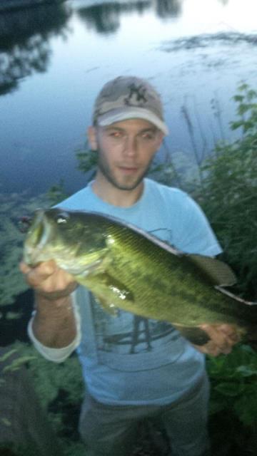 2nd cast and BOOM! El Gigante! (although it was a female lol). F'er went ballistic. Jumped 2-3 times then dove and made a beeline for a downed tree but she was turned rather easily with some effort and the help of 10 lb Sufix. Snapped a pic of her below... She swam away no worse for wear... same deal--5" plum apple senko
