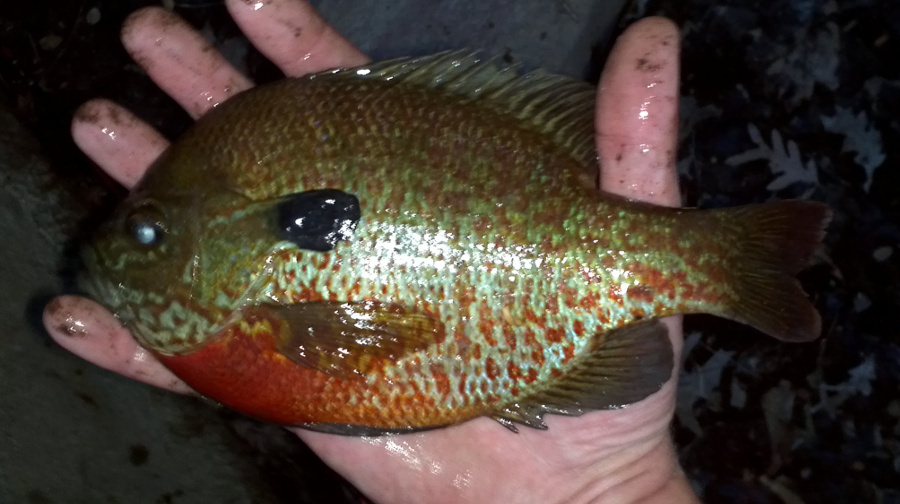 this is a hybrid bluegill / redbreast sunfish. note that it is shaped like a bluegill, has an eye like a bluegill, but has the red belly and speckling of the redbreast, and that the gill flap is huge - a combination of the shape/size of the two parent species that starts out a ways from the gill.