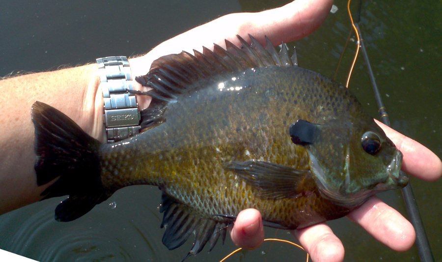 i like sunfish. around here, our usual suspects (and the identifying characteristic i use to tell them apart) are the bluegill (black spot behind gill, olive body), pumpkinseed (prominent greenish/blue spot pattern on sides, tiny mouth), redbreast sunfish (bright red belly, larger mouth) and the green sunfish (green spots, larger mouth). of these, red breasts give the best fight pound per pound, IMO.