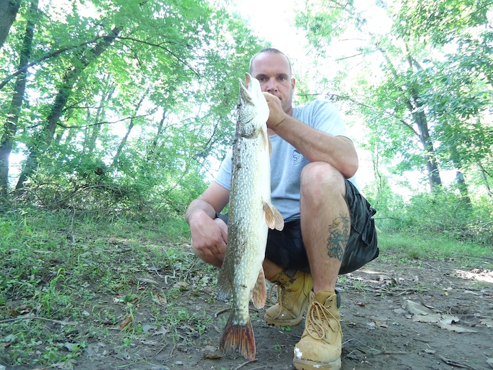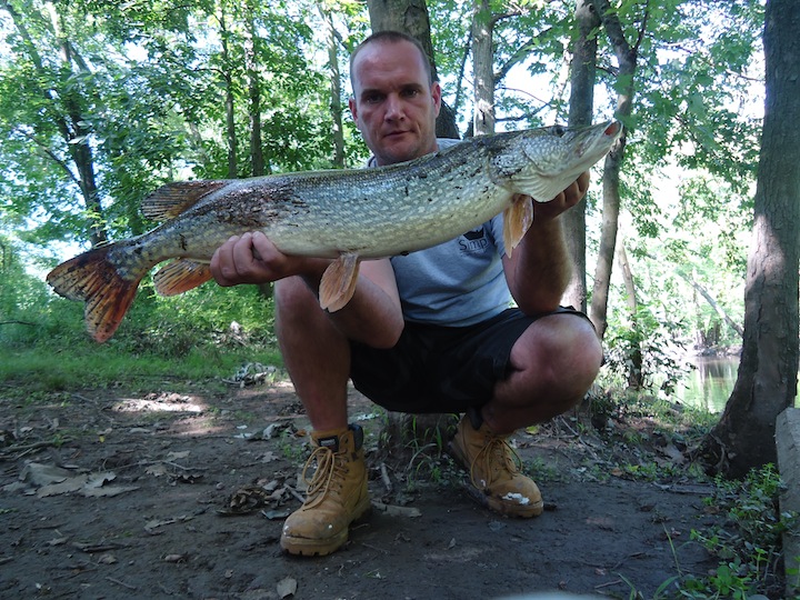 ![]() Hit the river for an hour this morning before returning to work unfortunately. After being off for 12 days I cant believe its back to the contractor grind. I went upstate NY and gas by me was 3.17 a gallon, now its 3.59 a gallon, WTF!!!! Did something happen while I was gone? And this heat wave sucks! For those of you who enjoy heat like this, YOUR NUTZ!!! You belong in an INSTITUTION!!! YUP, I'm going to say it, I can wait to go ICE-FISHING!!!! HAHAHAHAHAHAHA!!! Bring on the fall jigging and old man winter. Anyway, managed 4 Pike in an hour. 2 @ 24 inches, 1 @ 32 inches and another @ 33. The 2 bigguns were nice and thick. Thankfully, somebody has been feeding the Pike in my stretch so they are thicker than previous years catches.