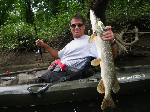 I tried the first spot for 2 hours with 1 pike at about 32", and this was the spot that I "thought" was going to be the best.......wrong! Loaded the kayak back in the car and went to spot #2. This was a good choice, I landed 5 pike in an hour from 8", to the best of the day at 34". I did miss one other that looked better, but lost it at the kayak trying to land it.