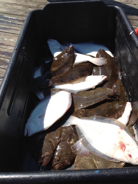 Saturday 8/10: Had Paul's charter on today. Ran out to where we've been catching the fluke and had a very slow pick -- the swell definitely had them off. The guys decided to try in on the beach for croakers - NG. Then we switched gears again and headed up the line for bluefish... Bite wasn't as good as it's been but the guys still wrecked them and we held 2-4 fish on at a time. In 2 drifts, we were done! Boxed up a load and landed about 75. Finished up fluking, and got a few more. Wound up keeping about 30 blues and had 4 keeper fluke to 4#.