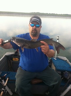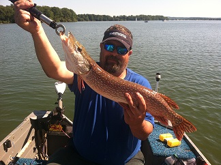 my daughters 5.2lb'er. Nice fish, but after that then there was a lull in the fishing for a while so we cruised the lake in search of but only to end up back where we started. LOL! Well we had a nice scenic tour and cooled off a bit and were ready for the afternoon bite. Shortly after the stripes started munching, ended up with a couple more, missed a few and lost one. And then another channel cat. (really amazes me they are hitting baits so far off the bottom). Then the reel is screaming again and I figure it's another hybrid but was I fooled, it's a nice sized Pike. First one in a very long time for me and first ever on the troll!!! Quite a nice surprise since earlier in the day I said to my daughter I need to catch a pike or musky before the year's up and BOOM, There it is!!!