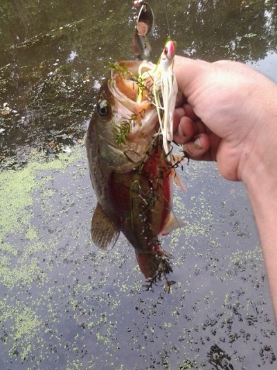 two casts later got a chunky little bucketmouth. Hopped in the car and headed downstream; got another pike, this one bigger, in the low 20's (inches that is ) but flopped off the bank and back in the water before i could take a pic. Switched to an inline and had another pike sniff it before darting back into the depths. Headed back upstream, tied the spinnerbait back on and caught a dink bass, then a bigger one shortly after. After getting a quick bite to eat tried driving all over the place for more access points but no luck..finished off the day at spot where i got the last pike. managed one more baby plus a bonus jumbo perch. While walking across rocks i slipped and fell in deeper water and soaked my jeans still a good day but next time i need to find better places for shoreline casting! |