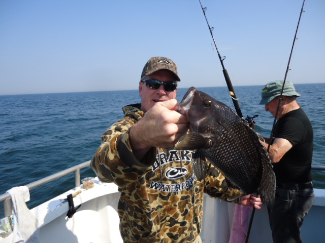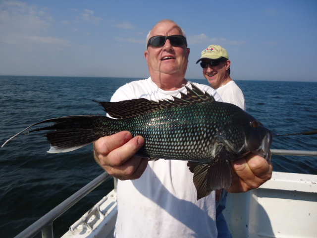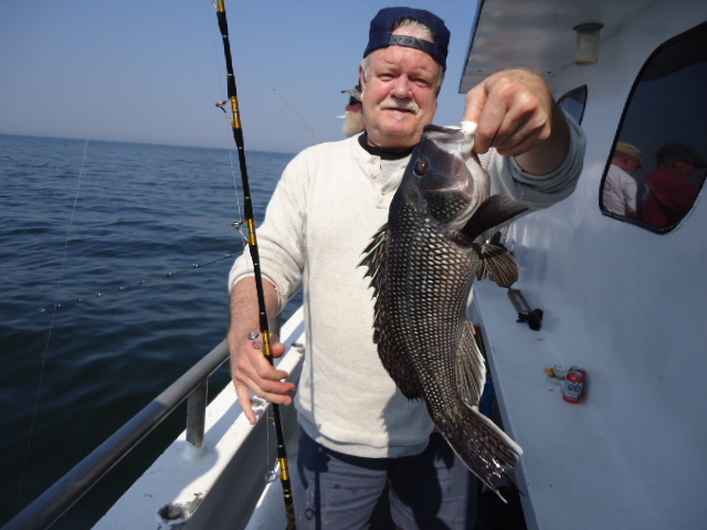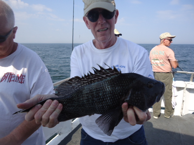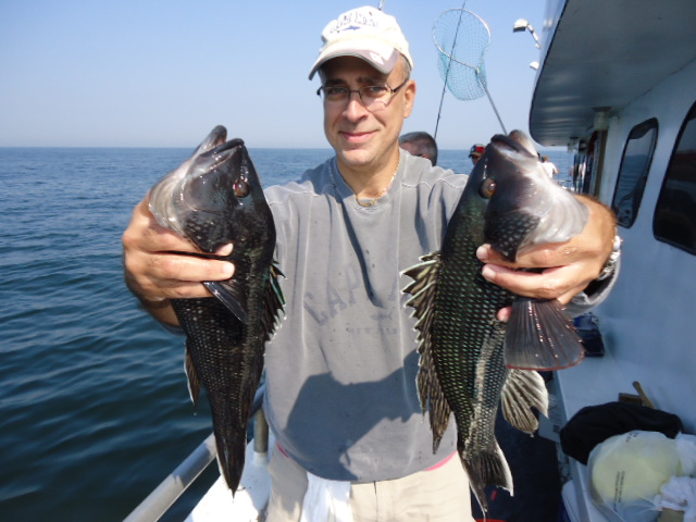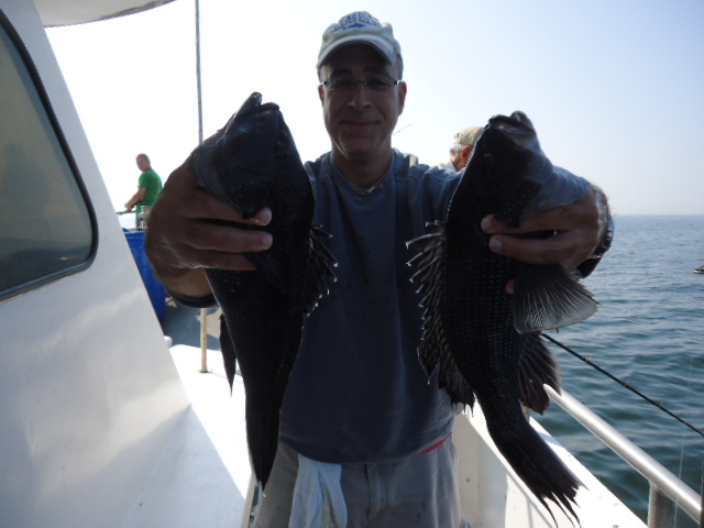 10-4-13 We had a really nice day today,,,again,,,trust me I am not getting sick of saying it..Flat calm and warm..Caught some really nice sea bass today as well..Just check out some pics here below..Jimmy in the first picture below took high hook award with 18 nice sea bass..He was doing no wrong today,,others had different catch totals,,some high some low,,,but overall for a decent crowd I though we had a pretty good day..Lots of manuvering looking for a good spot that had life,,,some little honey holes helped to..some spots were dead,,,had to move on when we had no life.Jigs,,Jigs,,Jigs,,,some did real well with em if you were doing it right..a-27 with no tails were the ticket.The fish are full of sand eels and very picky it seems like..I could get on some great readings and only pick at the fish but sending a jig down would sometimes get a nice fish to attack it.We also had to throwback some nice fluke,,some giant winter floiunder and we caught some ling as well.Oh,,also quite a few big eye mackerel which make for some nice sashimi........TOMORROW LOOKS GREAT,,GET IN AND GET ONBOARD CAUSE WE ARE GOING BACK AT IT AGAIN.....WEATHER LOOKS GREAT....BRING A BAIT ROD AND JIG ROD..SEE YA IN THE AM..PICS