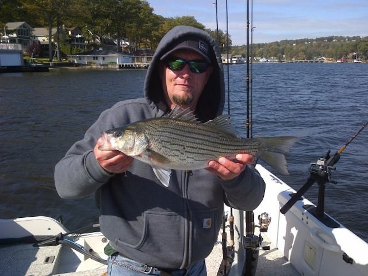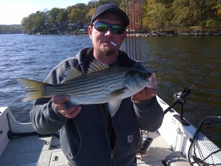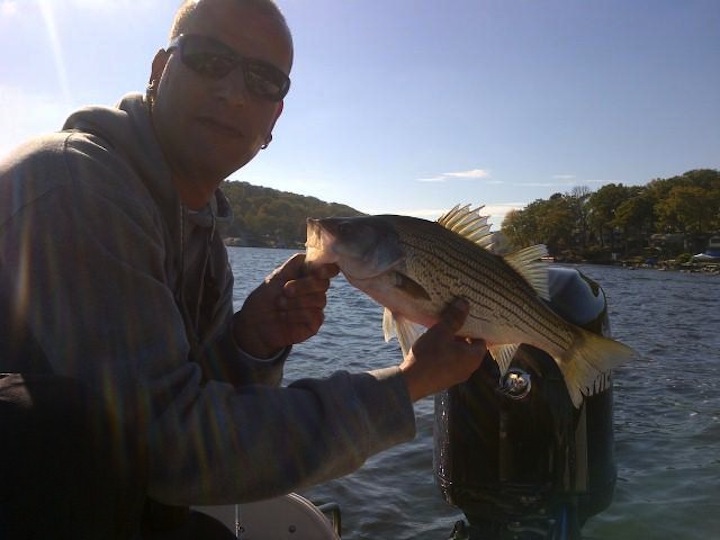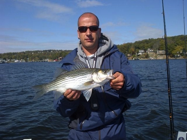 Fished with Jimmy the Greek today, if you want Hybrids, he might be the best man for the job on the BIG LAKE. He has everything if you come unprepared. We had a slowwwwww start in the morning but caught up and WHOOPED some ARSE in the afternoon. Boated somewhere around 12 Hybrids between the 2 of us. Some Schoolies and some quality fish, nothing huge. Consistent bursts of action got us back in the game. Almost had a few double headers but I muffed a hookset. First time fishing with the Herring on LH, I learned alot today and will be expanding my arsenal. Other catches included a couple Smallies by a few guys. A White Perch and a Slime Dart by yours truly. Lots of action out there today, just had to move around and deal with the snotty ENE wind that just wouldn't quit. All in all a GREAT day with GREAT GUYS! I'LL DO IT AGAIN ANYTIME!!! BEST MEET-N-GREET thus far when it comes to catching! Thanx again fellas, good to put names with faces. AS ALWAYS, TIGHT LINEZ!!!!!!!!!!!!!!!!! ![]()