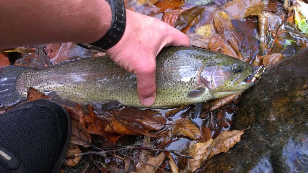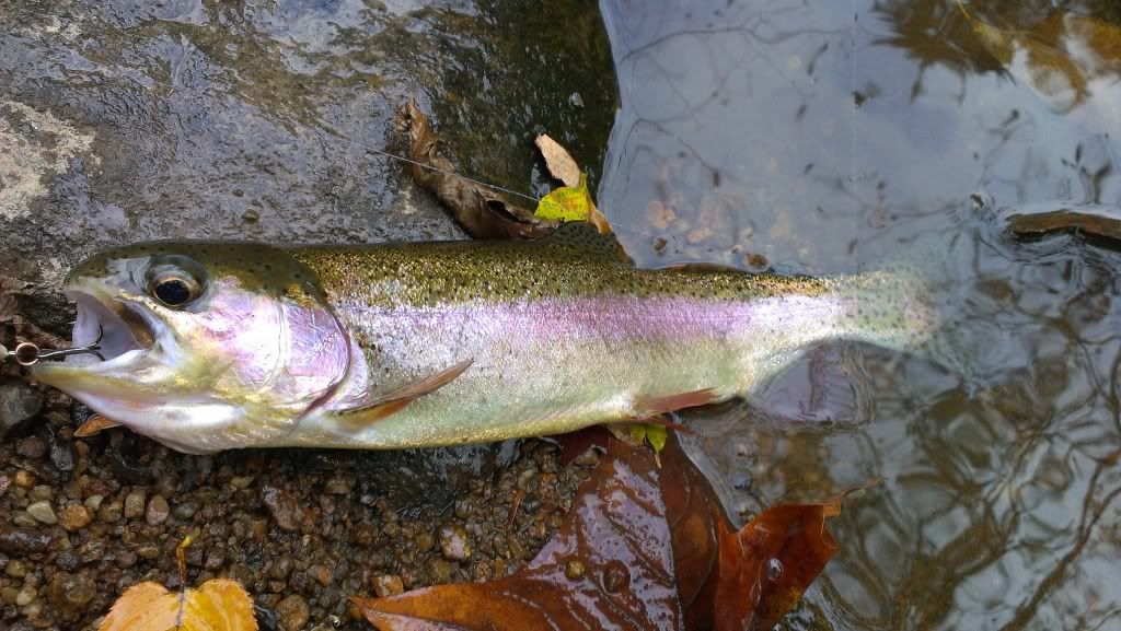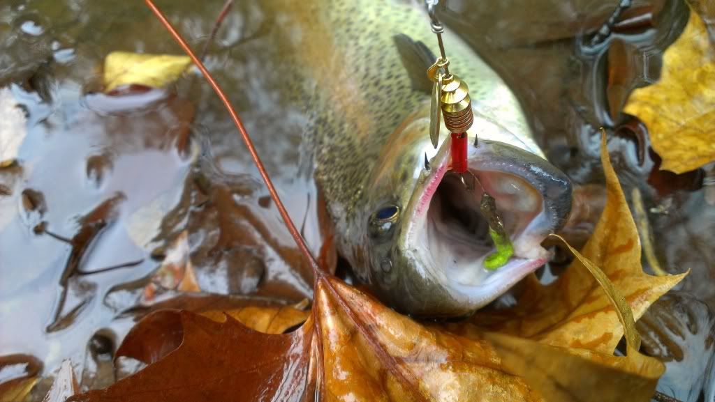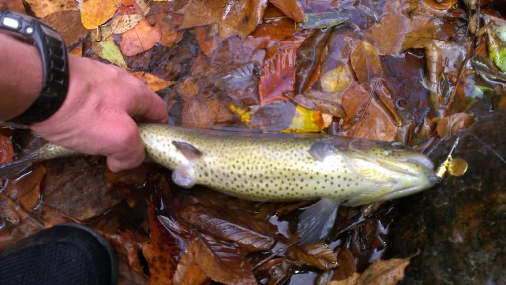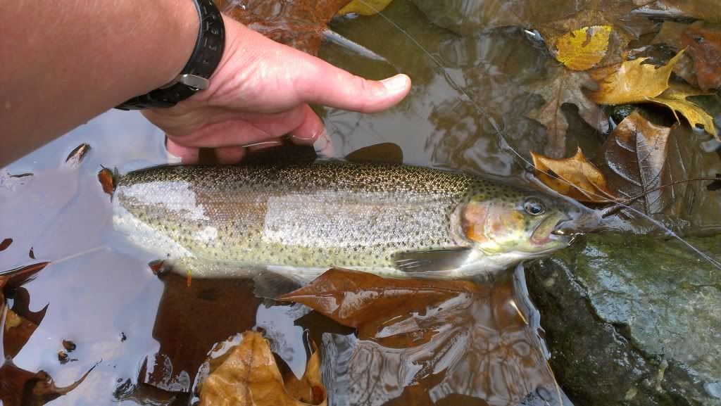 First couple casts yielded a small bow. Looked almost to small to be a spring stocker? Next was my pb wild brown! Got em on a size 1 blue fox brown trout spinner. Came in at 8/9 inches and was a feisty little cannibal, lol. After that I got into some nice thick bows. 5 total, all about the same size. First one came up with a fly hanging out of his mouth!!! Anyone lose a chartreuse wooly bugger? ![]() Really nice morning, started out cool and overcast and ended up sunny and warm. Leaves where in full effect and made it tough but not impossible to get some. Good times...... ![]() ![]() ![]() ![]() ![]() ![]() ![]() ![]() ![]()