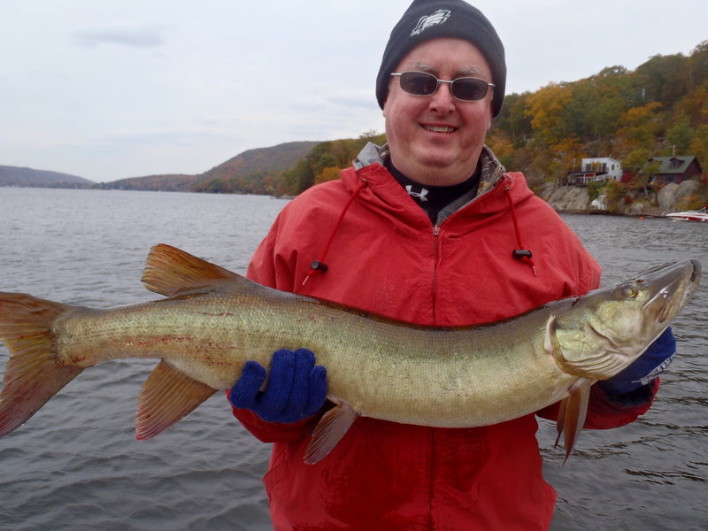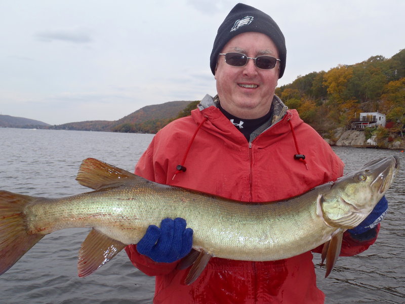 Gale Bower and his wife traveled from Cape May to catch a musky. His wife was never in a boat nor caught a fish. Started off slow so took them to a spot for a little action and they did great on some nice slabs. Then, returned his wife back to the dock/place they were staying over at on the lake and took Gale back out. First spot, second cast and he nails a 38 incher on a Squirrely Phantom. The fish was blind in its right eye but was in great shape and swam off fine. Next cast and an immediate Follow. Wow! talk about luck....it usually doesn't go this way when fishing for muskies. Congrats to both!