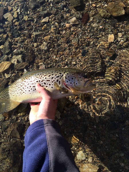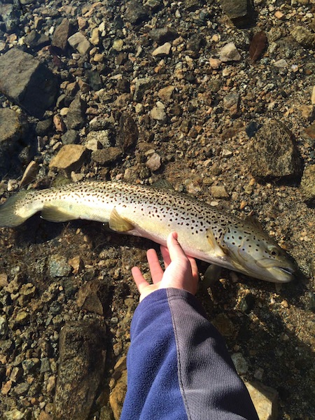 Got up at 6am and went on the hunt for the infamous RV trout. Round Valley is either a great success or utter failure for me, and my records here aren't that good. The last two trips I got the skunk, and a cold, but the warmer weathers persuaded me to still go. Stopped on the way down at Behre tackle shop, and got my usual 2 dozen shiners. When I rolled up into the boat dock area I was surprised that I was the only one there. The first area I fished was the sand bank across from the boat ramp. I fished from 6:30 to 9 with nothing but a good view, and a few birds. Coming to the conclusion that today was not my day, I packed up my stuff and went on a hike to find a new fishing spot. Once I go there I casted all three rods, shiners under a slip float, and chilled out. In the span of the next two hours I only got one bite. By 11 it was time for me to leave, and when i was reeling in one of my poles I noticed that one of my bobbers were missing. Of course this was the pole the farthest from where I was standing, roughly 50 ft away, so I started a full out sprint. Quickly set the hook thinking it was the usual 15 inch trout, only to see at the end of the line a Round Valley Tagged brown trout. This beauty was thick, and I think 24 inches long. The fish was tired out, and my pliers were far away so I left the tag in and quickly released it after a few pictures. It swam off fine, and I saw it swimming around an hour later. It may not seem like it, due to the water clearness, but the trout never left the water